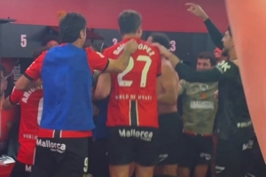 赛后马略卡球员在更衣室内激情庆祝,更衣室的桌子上摆满了美食。