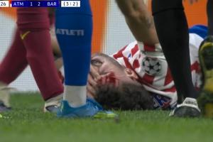 体育资讯04月15日讯 欧冠1/4决赛次回合,马竞vs巴萨,鲁杰里被加维肘击,倒地满脸是血