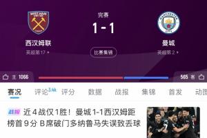 你想到了吗?一个月前曼城1-1西汉姆落后9分,此后两轮净追6分!